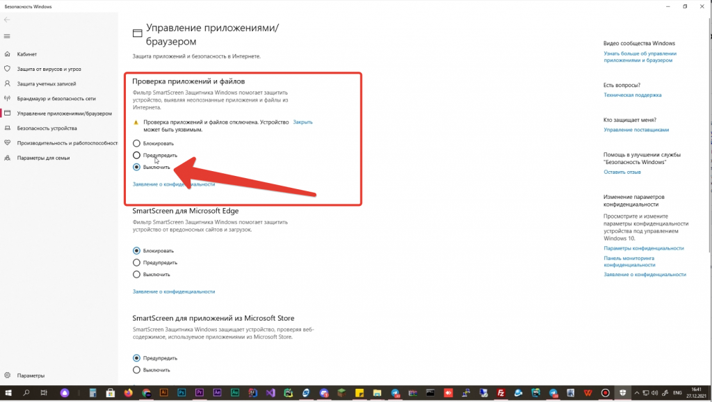 Если вы все правильно сделали, далее должно появиться окно с настройками, а там в разделе проверка приложений и файлов нам просто нужно выбрать пункт выключить, как на картинке ниже:
