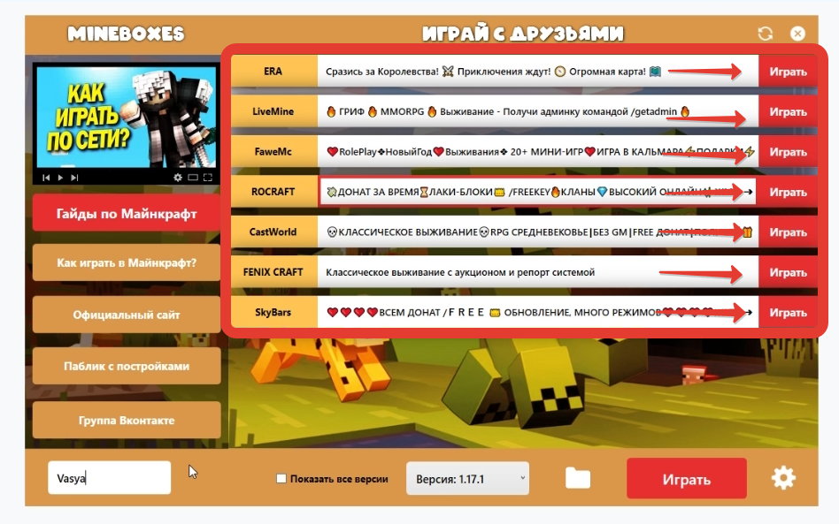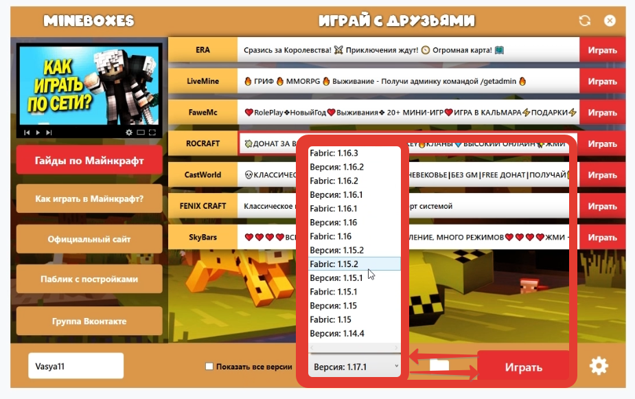 Второй – это мультиплеер для игры с друзьями на серверах, он не зависит от списка версий в нижней части лаунчера, там запускается та версия, на которой запущен сам сервер. Поиграть таким способом можно через верхние правые кнопки играть.