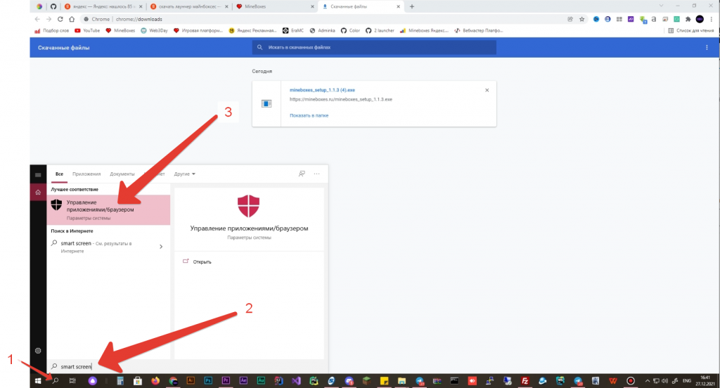 Далее немного сложный момент. Дело в том, что Windows 10 запрещает установку почти всех файлов, которые вы скачиваете из интернета, поэтому, нам нужно разрешить ему запуск файлов. Для этого мы открываем встроенный поиск и вводим туда smart screen, затем выбираем пункт управление приложением/браузером, как на картинке ниже