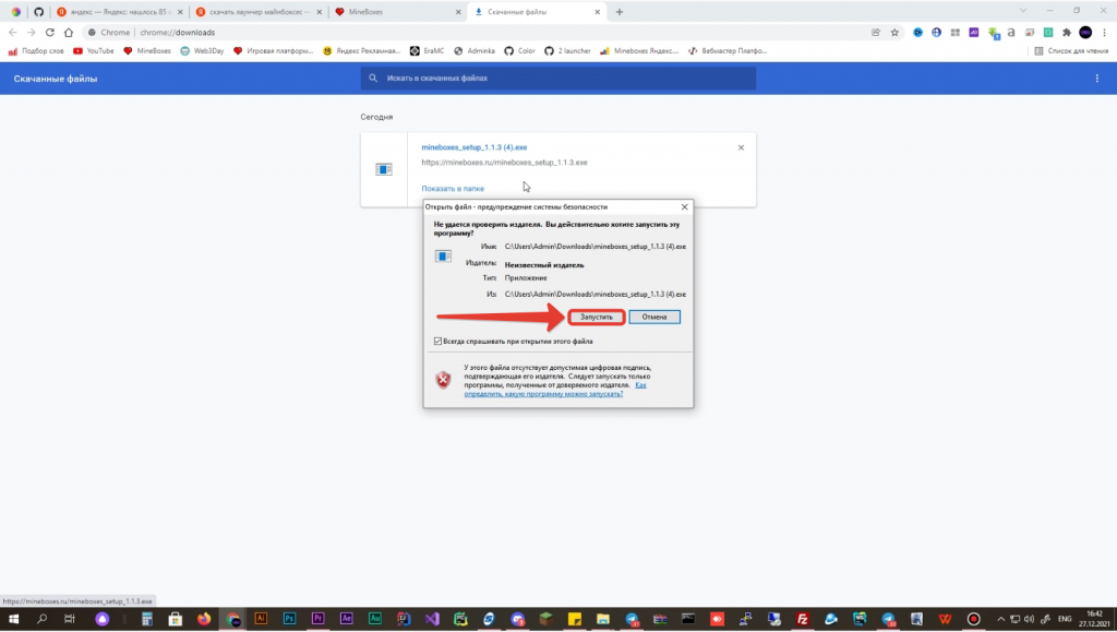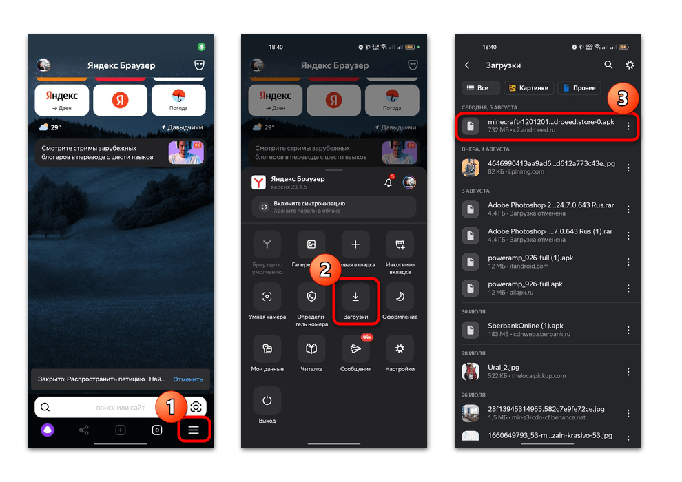 Если вы собираетесь запустить установочный файл из браузера, то откройте окно со скачанными данными. Например, в Яндекс Браузере нужно нажать на три горизонтальные полоски на нижней панели, затем выбрать кнопку «Загрузки», а потом из списка скачанных файлов нажать на APK игры Minecraft.