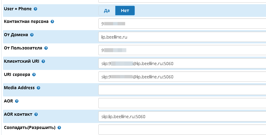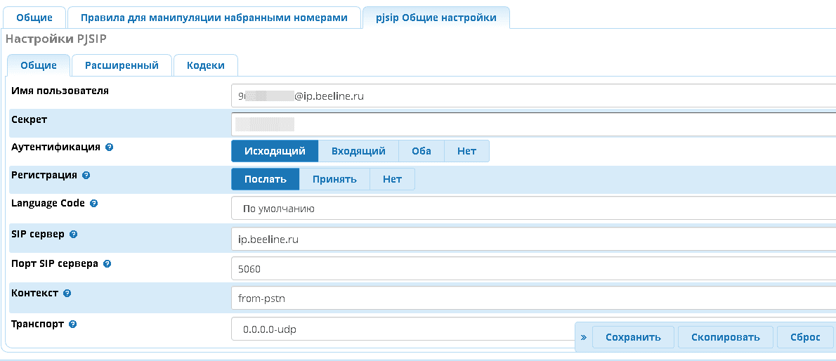 host=mpbx.sip.beeline.rufromdomain=mpbx.sip.beeline.rufromuser=9XXXXXXXXXusername=9XXXXXXXXXsecret=passwordtype=peerqualify=300insecure=invite,portdisallow=alldirectmedia=noallow=alaw&ulaw