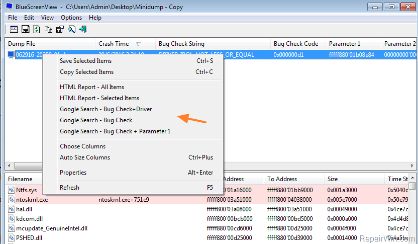 5. After viewing the BSOD Minidump information, search the web for an available solution by typing the displayed «Bug Check String», the «Bug Check Code» and the module that causes the blue screen – crash – problem. e.g. search for «DRIVER_IRQL_NOT_LESS_OR_EQUAL Ntfs.sys» or «DRIVER_IRQL NOT LESS OR EQUAL 0x000000d1»