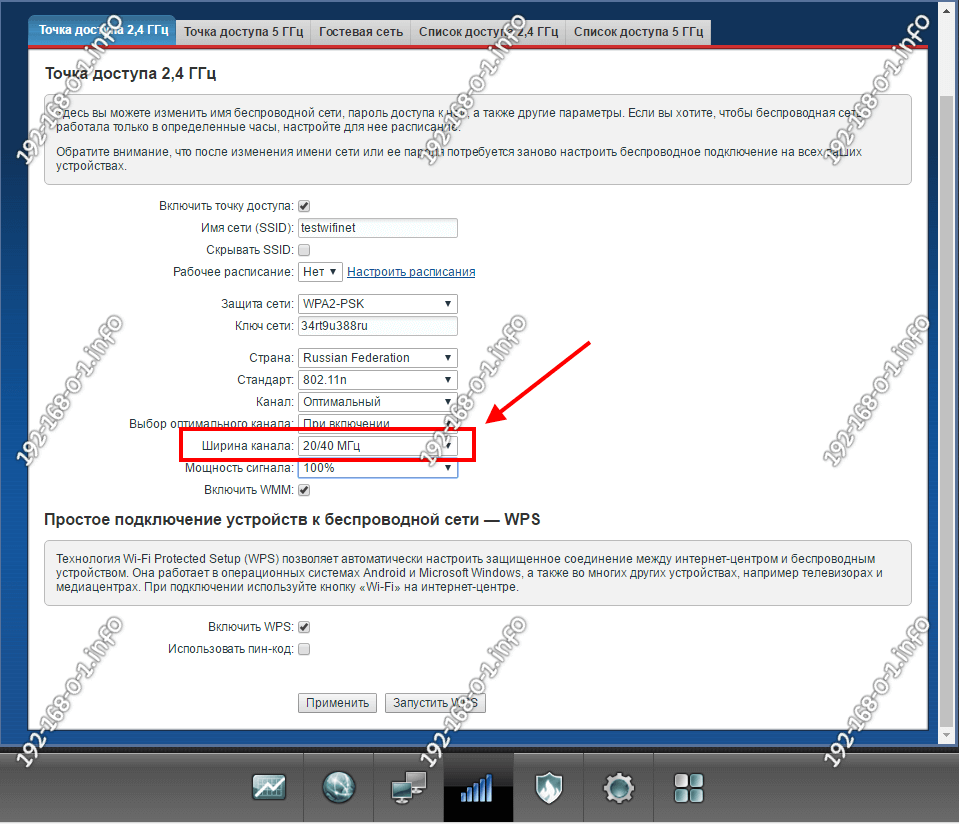 - Изменение ширины канала. Чтобы повышать пропускную способность, необходимо поменять ширину канала на 20 МГц. Это должно увеличивать быстродействие беспроводного интернета.