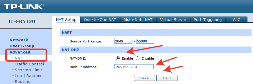Бюджетные модели этих сетевых устройств не имеют возможности создать полноценную зону для всех участников в нашем сегменте сети, но нам это и не нужно. Главное, что есть возможность добавить в Демилитаризованную зону один IP-адрес видимой станции. Этим действием, мы сделаем DMZ-хост и откроем доступ из внешней сети ко всем его доступным портам.
