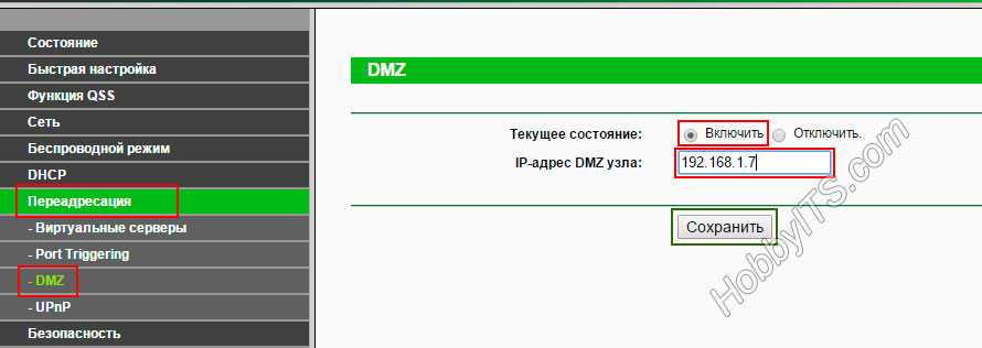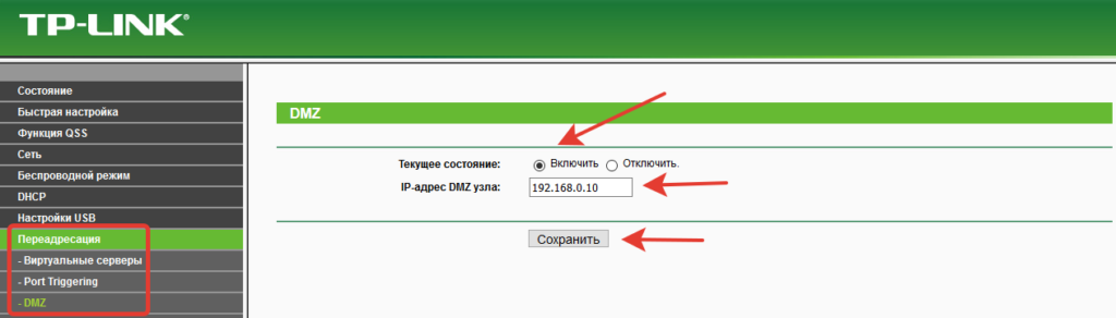 На роутере компании TP-Link включить DMZ можно в разделе «Переадресация» (Forwarding) -> «DMZ».