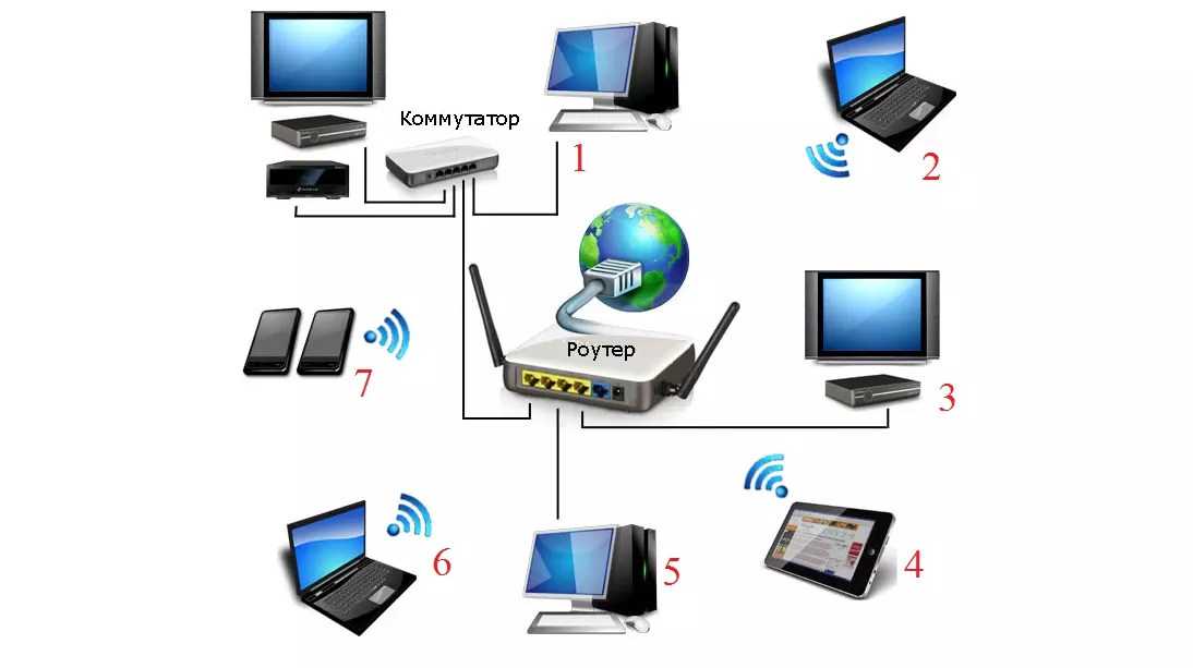 Как видим, здесь основным элементом сети является роутер, который подключен к интернету (WAN). Запомните эту аббревиатуру, о ней мы еще поговорим.