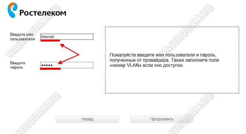 Далее надо прописать имя пользователя и пароль для входа в Интернет, которые Вы получили при заключении договора с Ростелеком: