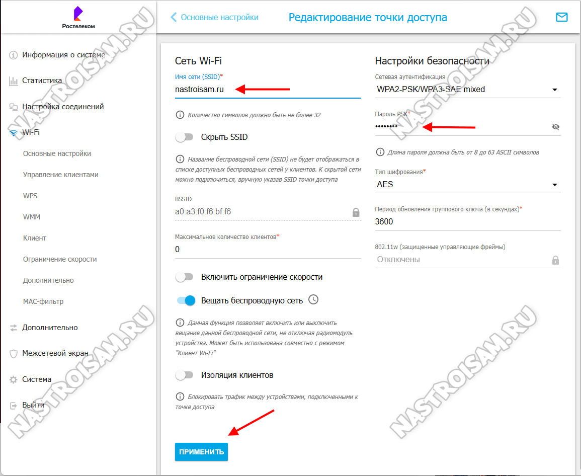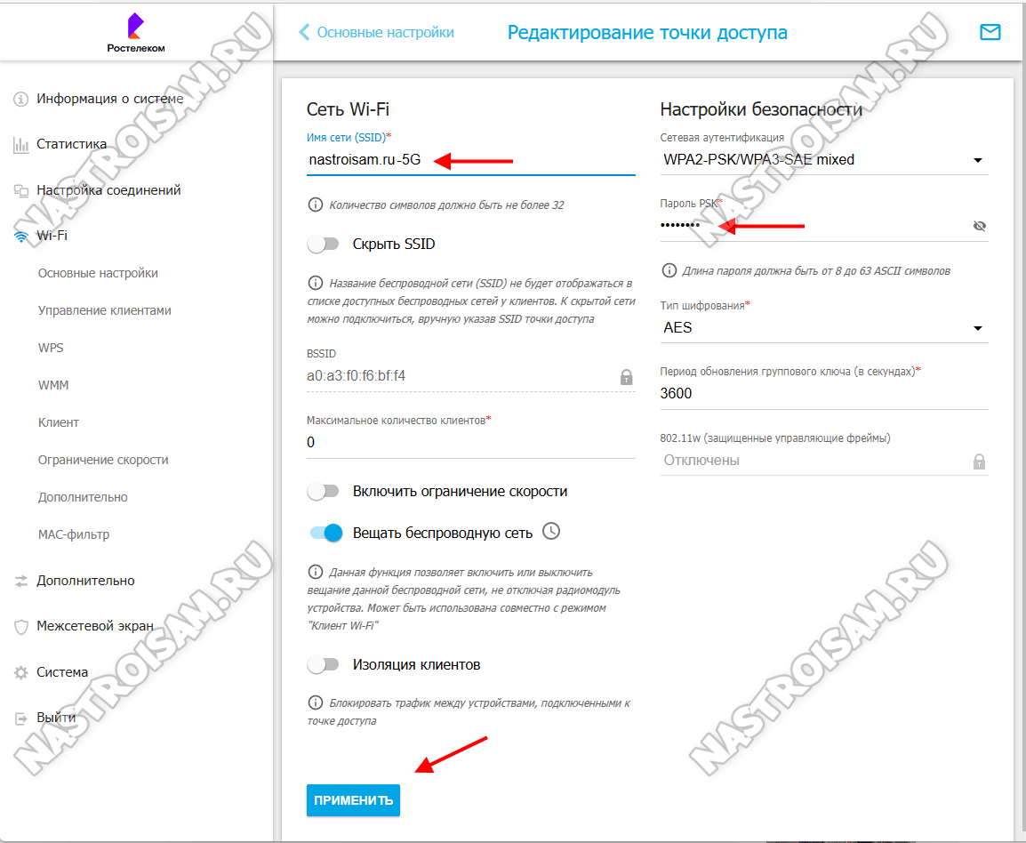 Здесь можно будет в поле «Имя сети (SSID)» изменить название сети на своё. А в поле «Пароль PSK» можно будет поменять пароль Wi-Fi. Тут можно использовать любую последовательность букв, цифр и спецзнаков не короче 8-10 символов.