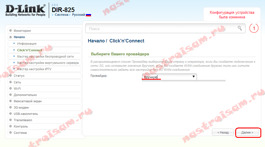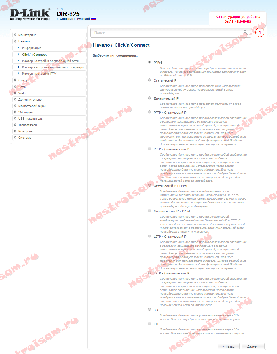 В нижнем правом углу имеется кнопка «Далее», которая переведёт пользователя к следующему шагу настройки. Здесь будет предложено выбрать тип соединения. Верхний пункт — PPPoE используется большинством провайдеров, поэтому дальнейшие настройки будут описаны именно для этого подключения.