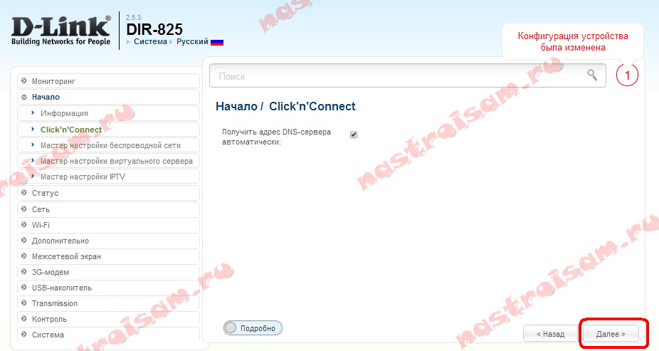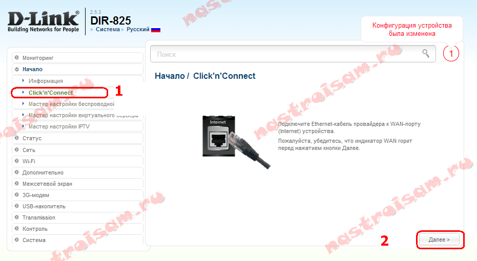 На самой первой странице отобразится вся информация о том, что представляет собой данный роутер. Здесь указаны модель, прошивка и текущее состояние соединения. Для настройки подключения к сети Интернет через порт WAN нужно нажать Click’n’Connect. Данный пункт представляет собой специальный мастер, который проведёт по всем этапам конфигурации и поможет создать своё первое подключение.