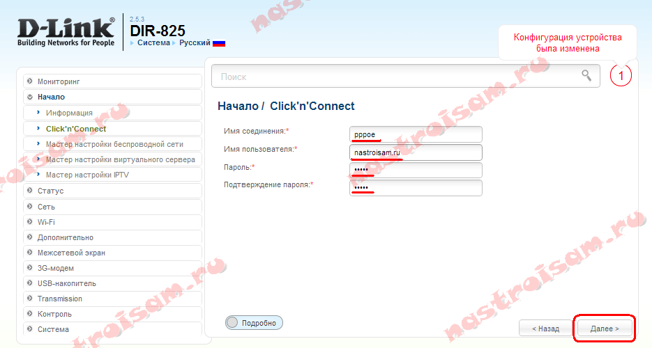 На следующем шаге нужно ввести немного данных. А именно придумать имя соединения, имя пользователя и пароль. Название можно выбрать любое или же оставить по умолчанию, все равно его будет видно только в веб-интерфейсе. А вот имя с паролем выдаёт провайдер интернета, и эти сведения должны быть указаны в договоре на подключение услуг.