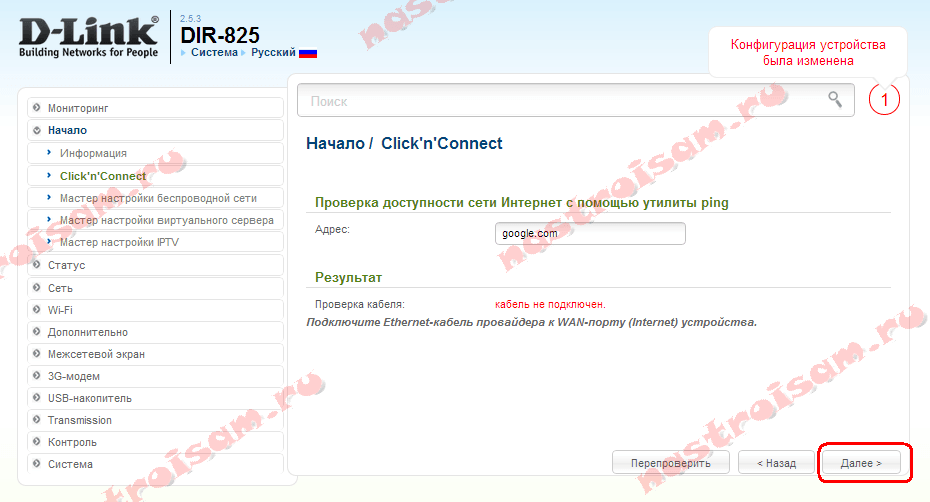 Роутер проверит доступность адреса (по умолчанию это google). Если Вы подключили WAN-кабель, то проверка должна пройти успешно. Нажимаем «Далее».