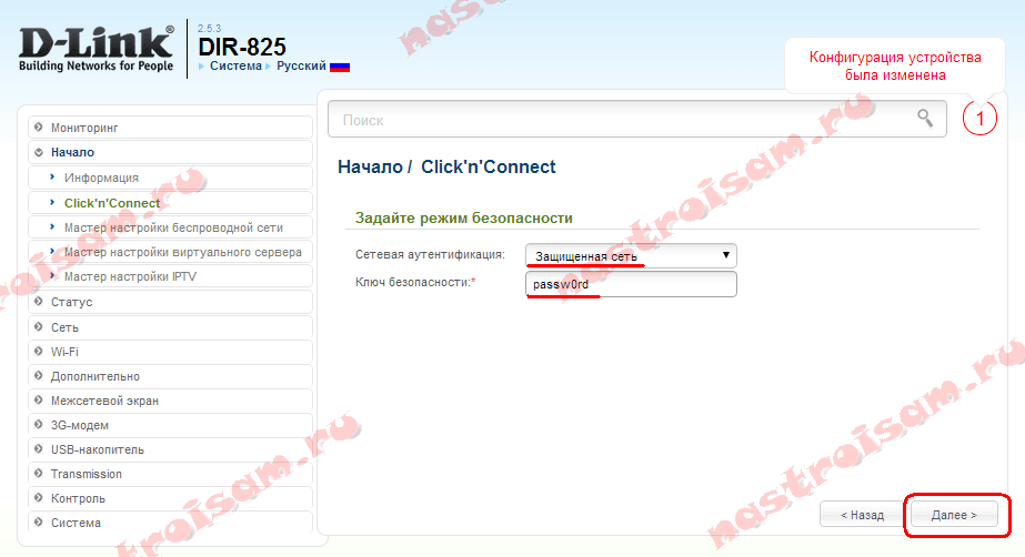 В списке «Сетевая аутентификация» выбираем «Защищенная сеть» и пишем пароль на WiFi в поле «Ключ безопасности». В качестве него можно использовать буквенную, цифирную или смешанную последовательность не короче 8 символов. Нажимаем кнопку Далее.