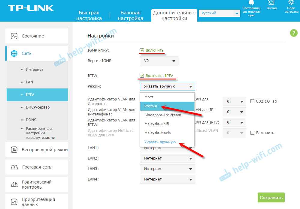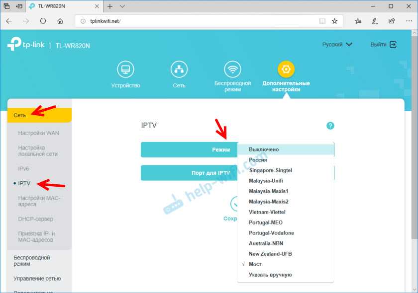 У TP-Link появилась еще одна панель управления (например, на TP-Link TL-WR820N) и там настройки IPTV выглядят немного по-другому. Находятся они в разделе «Сеть» – «IPTV». Для начала нужно выбрать страну, или режим работы («Мост» или «Указать вручную») . И указать необходимые параметры VLAN, или просто выбрать LAN-порт (или несколько) , которые будут использоваться для IPTV (для подключения приставки) .