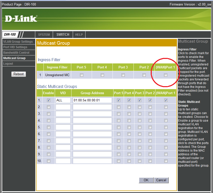 и убираем флажок в таблице Ingress Filter в строке Unregistered MC в столбце (WAN)Port1 и нажимаем на кнопку ОК.