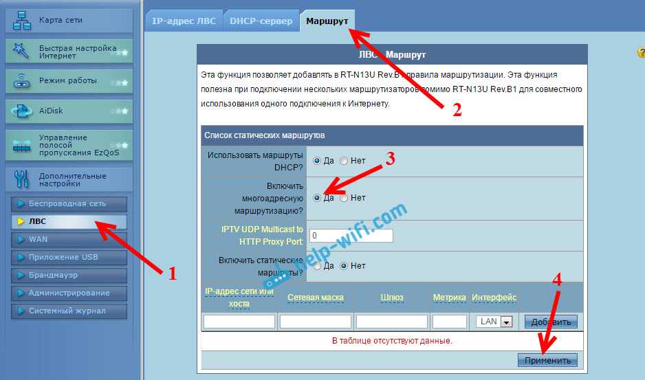 Для включения поддержки IGMP (Multicast) откройте вкладку ЛВС – Маршрут. Напротив пункта «Включить многоадресную маршрутизацию?» установите Да и нажмите кнопку Применить.