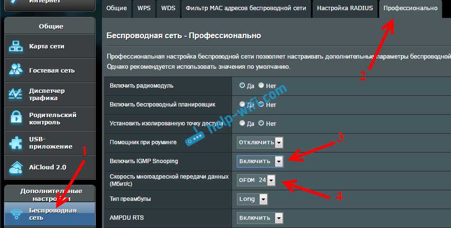 Перейдите на вкладку Беспроводная сеть – Профессионально. Найдите там пункт меню «Включить IGMP Snooping» и установите «Включить». А в меню «Скорость многоадресной передачи данных (Мбит/с)» выберите «OFDM 24».