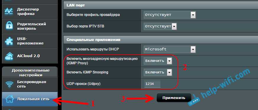 Маршрутизаторы с темным интерфейсом имеют прошивку ASUSWRT, где для настройки интерактивного телевидения разработчики создали отдельную вкладку. После того как вы войдете в интерфейс Wi-Fi роутера откройте раздел «Локальная сеть» и перейдите на специализированную вкладку «IPTV». На данной странице вам нужно активировать параметры «Включить многоадресную маршрутизацию (IGMP Proxy)» и «Включить IGMP Snooping» (может иметь название «Enable efficient multicast forwarding»).