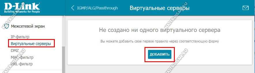 Для того, чтобы пробросить или открыть порт для игры, файлообменника или подключить IP-камеру к роутеру, открываем раздел «Межсетевой экран» и выбираем пункт «Виртуальные серверы»:
