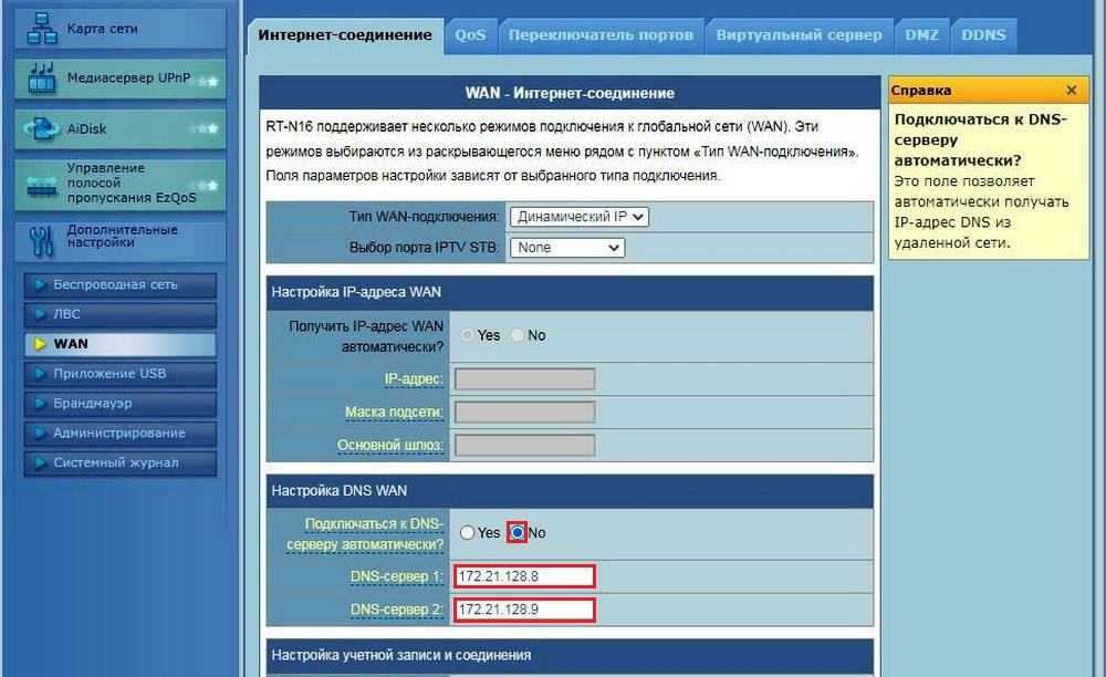 Первая вкладка отвечает за настройку интернет–соединения. Здесь вам нужно поставить «Нет» («No») напротив строки «Подключаться к DNS–серверу автоматически?». Далее замените автоматически прописанный DNS на новый вариант.