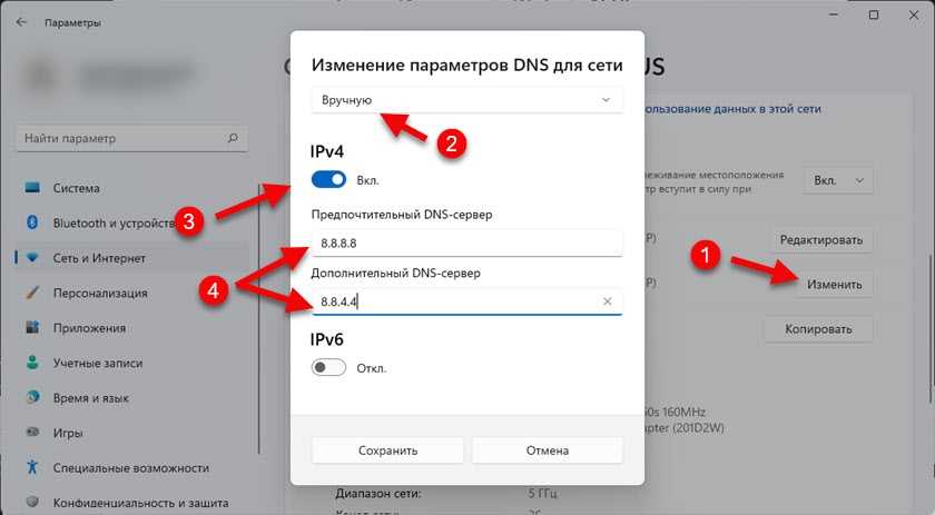 В Выпадающем меню выбираем «Вручную», включаем «IPv4» и прописываем DNS-серверы. В поле «Предпочтительный DNS-сервер» – 8.8.8.8 и в поле «Дополнительный DNS-сервер» – 8.8.4.4. Это серверы от Google. При необходимости вы можете прописать свои.Нажмите на кнопку «Сохранить».