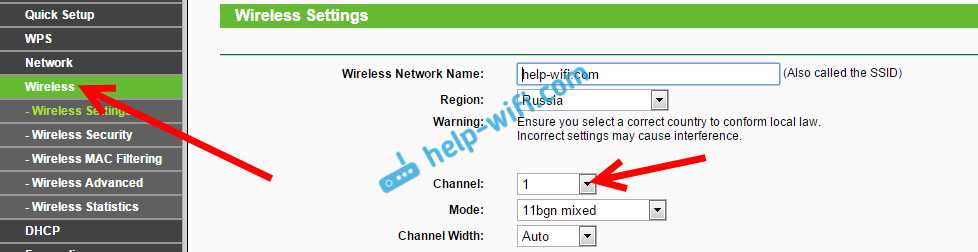 Например, если Ваш основной роутер – другой TP-Link, вы можете изменить канал в настройках, перейдя на вкладку Wireless . В поле Channel укажите статический канал.. Например: 1 или 9, что угодно. Сохраните настройки.