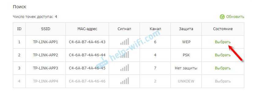 - Строка «Выбора беспроводной сети» – там будет указание сети Wi-Fi главного устройства. Если там пусто, тот нужно воспользоваться кнопкой «Поиска сетей». В высветившемся перечне необходимо выбрать свой вариант.