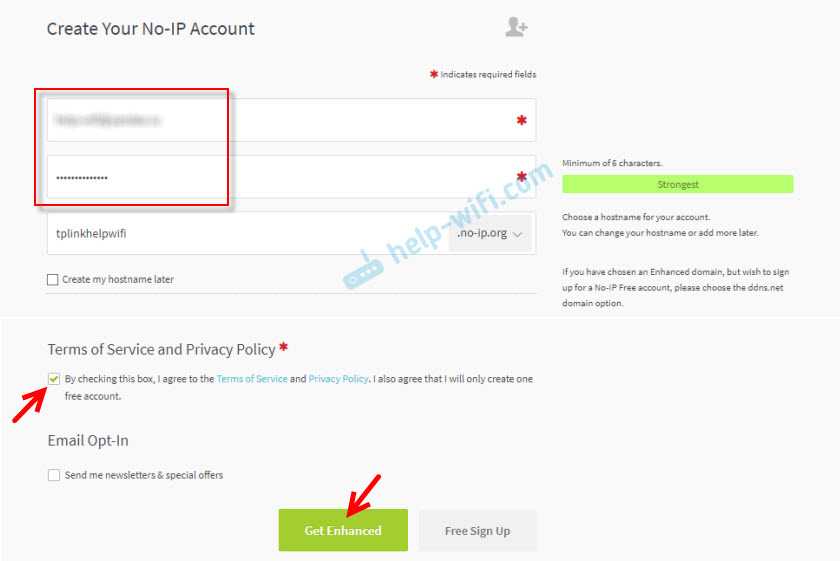Дальше нужно указать свою почту, придумать и указать пароль (эту почту и пароль мы будем вводить еще в настройках роутера), принять лицензионное соглашение и нажать на кнопку «Get Enhanced».