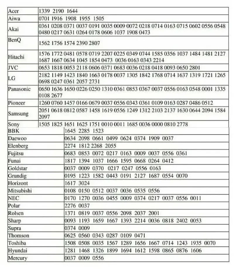 - Выберите код настройки из таблицы. Забейте его с помощью цифр на пульте.