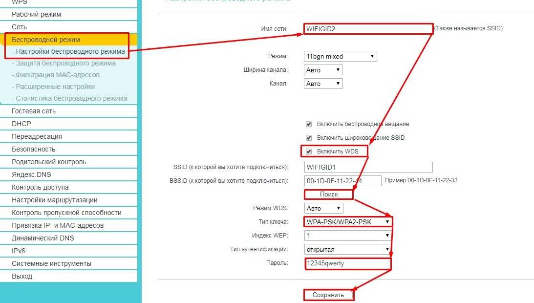 Теперь самое главное, нам нужно с этого второго роутера подключиться к беспроводной сети первого. Для этого в разделе «Беспроводной режим» – «Настройки беспроводного режима» – сначала устанавливаем имя второй Wi-Fi и обязательно установите канал как на первом (на скриншоте это не показано). Далее включаем галочку WDS. Ниже нажимаем «Поиск» и выбираем нашу сеть (в моем случае это WIFIGID1). Ниже указываем тип шифрования, который стоит в настройках первого. Вводим пароль и нажимаем «Сохранить».