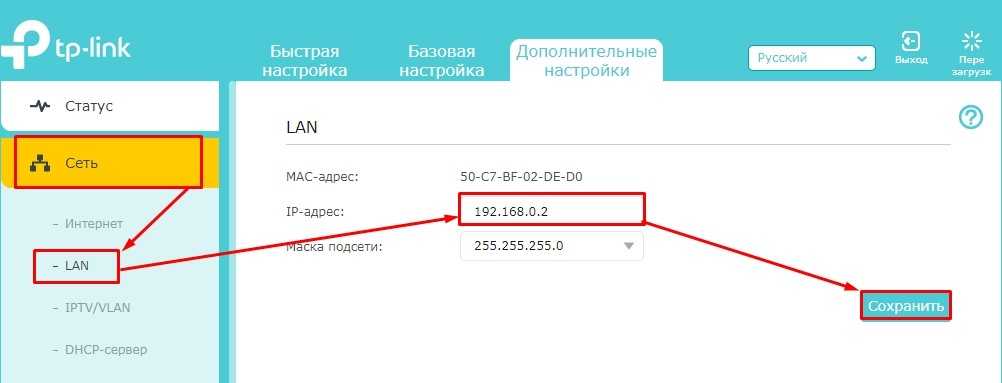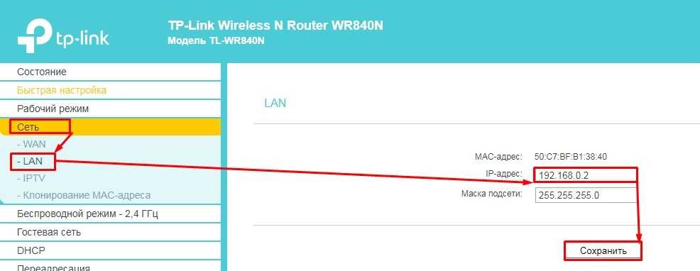 Чтобы поменять IP маршрутизатора, переходим: «Сеть» – «LAN» – далее меняем только последнюю цифру на 2 и сохраняемся.