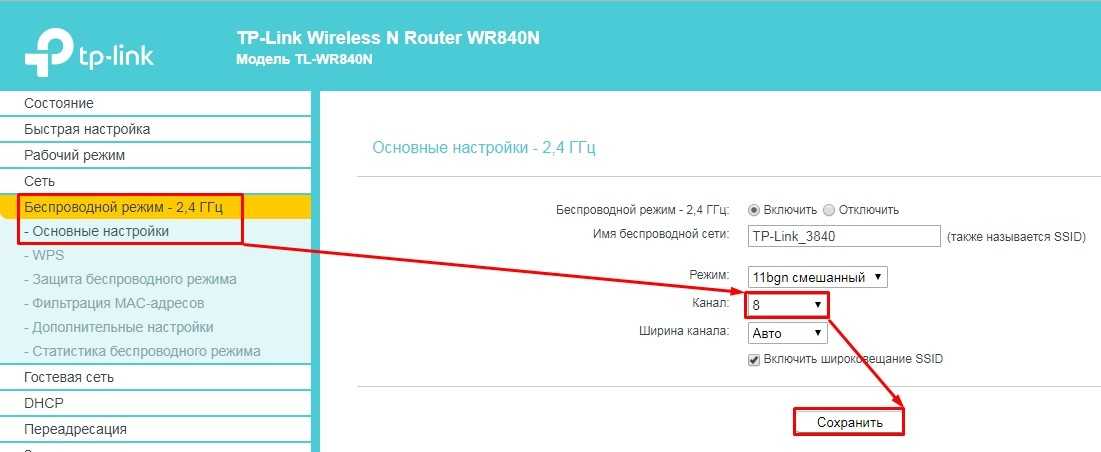 Подключаемся к роутеру и в браузере вводим: http://tplinklogin.net или один из двух адресов – 192.168.1.1, 192.168.0.1. На старой прошивке (может быть зеленого цвета) переходим в раздел «Беспроводной режим» – «Основные настройки». Устанавливаем канал и сохраняемся.