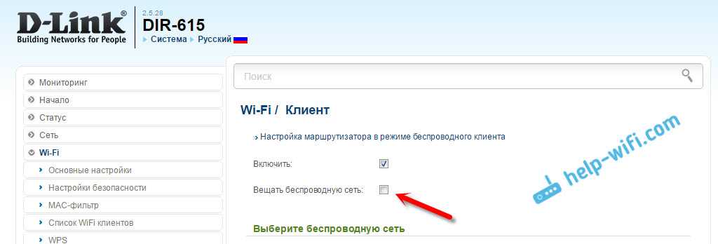 По сути, режим «Клиент», это и есть режим адаптера. Ведь роутер по Wi-Fi подключается к другому роутеру, и передает интернет по сетевому кабелю. Настраиваем все точно так же, как я показывал в первом разделе этой статьи. Только, если вам не нужен интернет по Wi-Fi от второго маршрутизатора, а только по кабелю, то в процессе настройки уберите галочку с пункта «Вещать беспроводную сеть».
