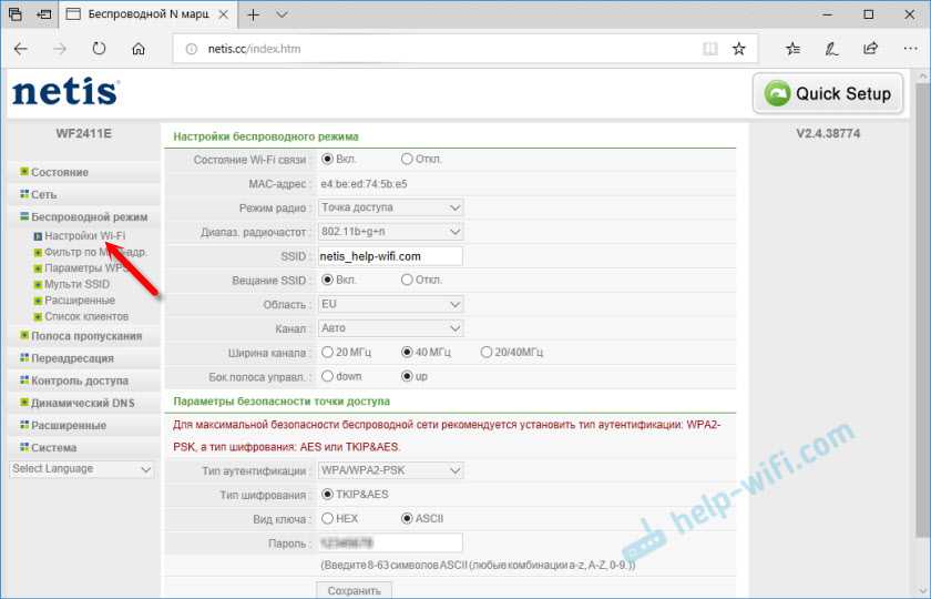 Сменить пароль Wi-Fi сети, или имя (SSID) можно в разделе «Беспородной режим» – «Настройки WiFi». Там же можно поменять номер канала беспроводной сети и ширину канала. Это на случай, если возникнут проблемы с подключением определенных устройств, или будет слишком низкая скорость подключения по беспроводный сети. В этом же разделе можно сменить режим работы радио (по умолчанию там «Точка доступа»), и использовать Netis WF2411E в качестве репитера, например, или Wi-Fi приемника.