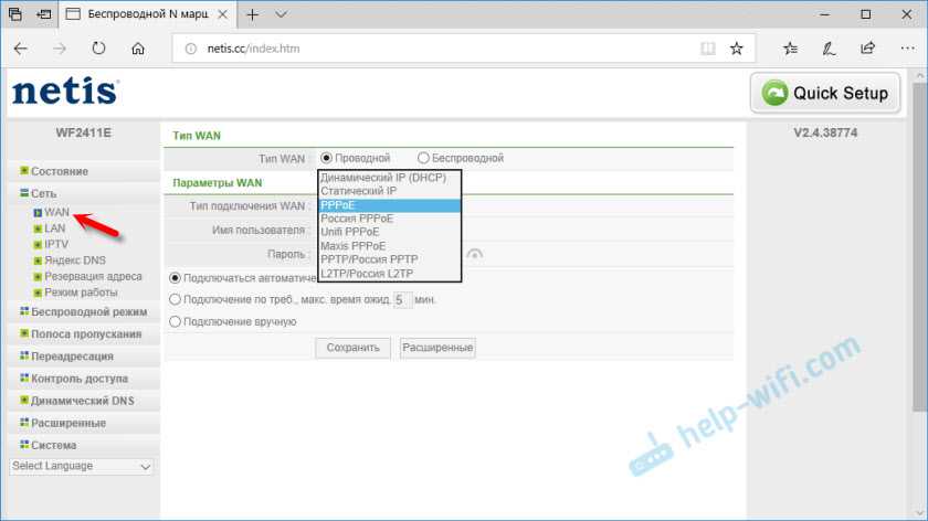 Базовая настройка netis N1 через встроенный мастер выполняется максимально просто. Она разделена на 2 части. Первая отвечает за подключение к Интернету, вторая — за работу беспроводной сети. По умолчанию, тип подключения выставлен как Динамический IP (DHCP), который используется в Билайн и ТТК-урал. Если же Ваш провайдер использует протокол PPPoE — выберите его в списке.