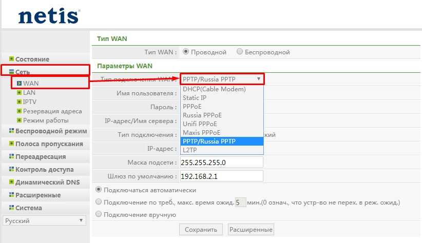 Для настройки интернета заходим: «Сеть» – «WAN». Теперь нужно выбрать тип подключения. Тут есть настройки для PPTP и L2TP. Где нужно помимо IP адреса, маски и шлюза – ввести логин и пароль. Как только вы введете нужные настройки не забудьте сохраниться.