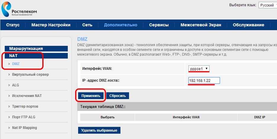 Заходим в раздел «Дополнительно» -> «NAT»-> «DMZ»: