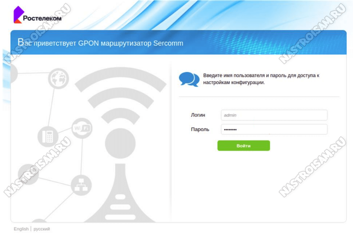 IP-адрес WiFi маршрутизатора Sercomm S1010 от Ростелеком в локальной сети — 192.168.0.1 либо через URL-адрес http://RT. Логин для входа — admin. А вот пароль нужно смотреть на стикере, который приклеен с нижней стороны корпуса устройства: