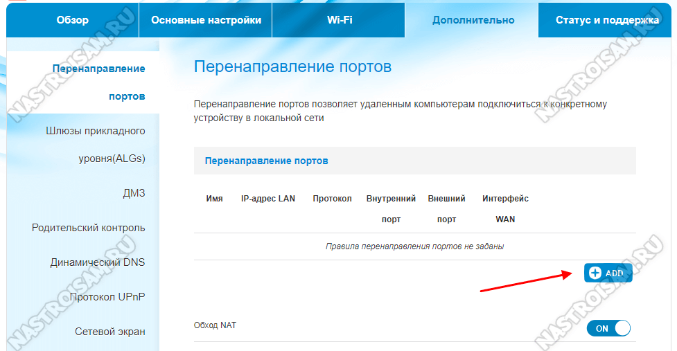 Чтобы самостоятельно открыть и пробросить порт на терминале Ростелеком RT-GM-6 для какой-нибудь игры, либо файлообменной программы, надо в меню открыть раздел «Дополнительно» → «Перенаправление портов». Там нужно создать новое правило. Для этого нажимаем кнопку с плюсом «ADD»: