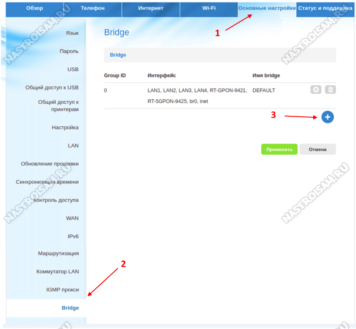 Настройка IPTV на GPON роутере RT-GM-6 в большинстве филиалов Ростелекома заключается в создании интерфейса типа «Мост» и привязка его к одному из портов. Для этого надо зайти в раздел «Основные настройки» → «Bridge» и нажать на кнопку с плюсом: