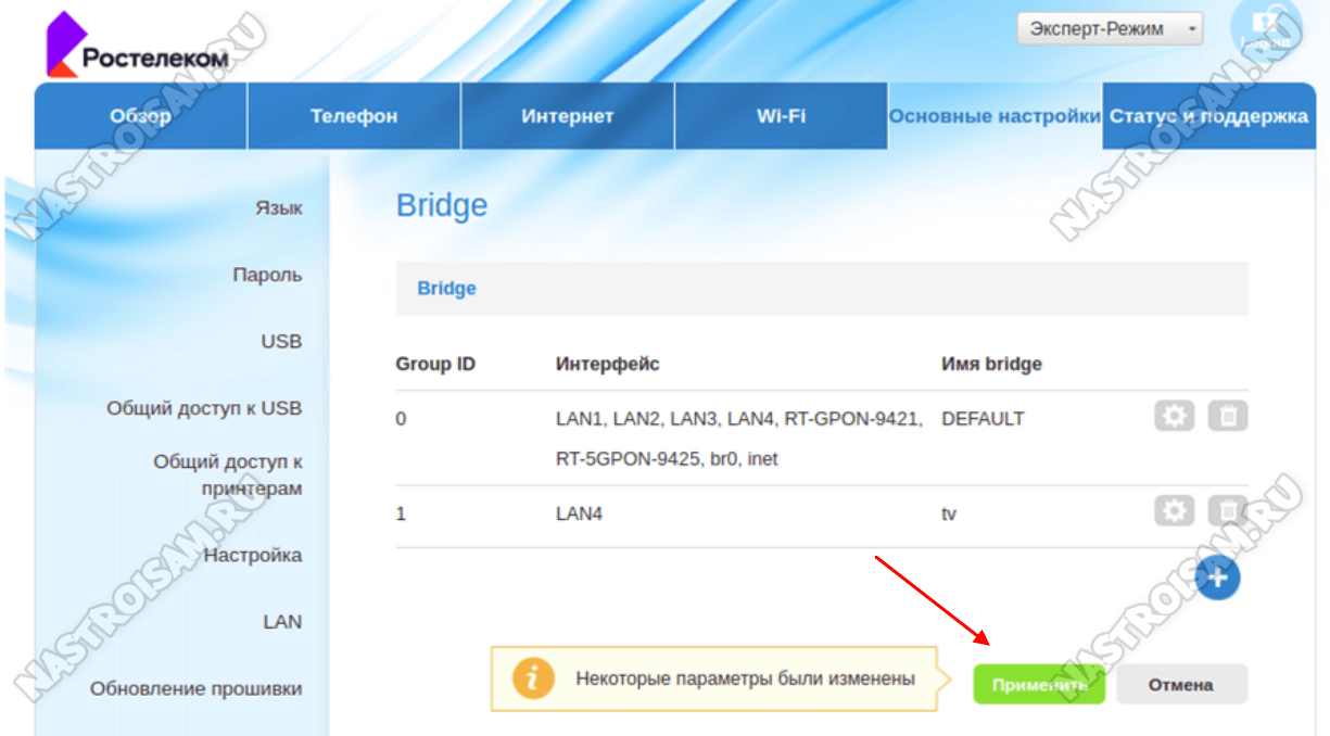 Включаем VLAN и прописываем идентификатор VLAN ID для цифрового ТВ в соответствующее поле. Приоритет 802.1p для телевидения ставим «4». Протокол «Bridged», то есть типа «Мост». Нажимаем кнопку «Применить изменения».
