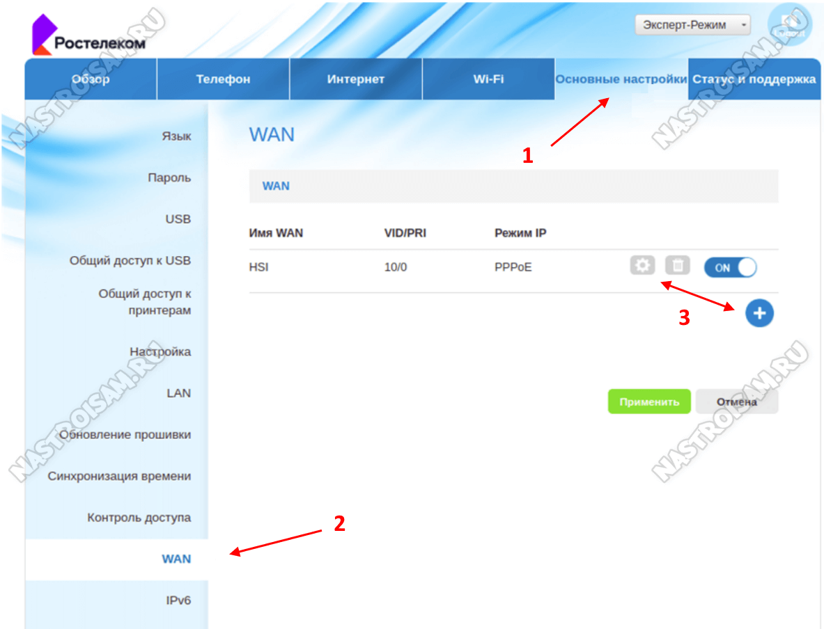 Откройте раздел меню «Основные настройки» → «WAN». Там по умолчанию у RT-GM-6 есть одно соединение с названием «HSI». Можно отредактировать его, нажав на значок с шестерёнкой, но я предпочитаю его не трогать и создать новое соединение, нажав на кнопку с плюсом.