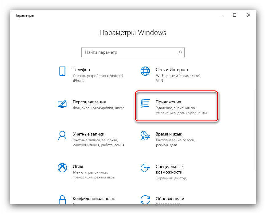 - Вызовите «Параметры» сочетанием клавиш Win+I, затем выберите пункт «Приложения».