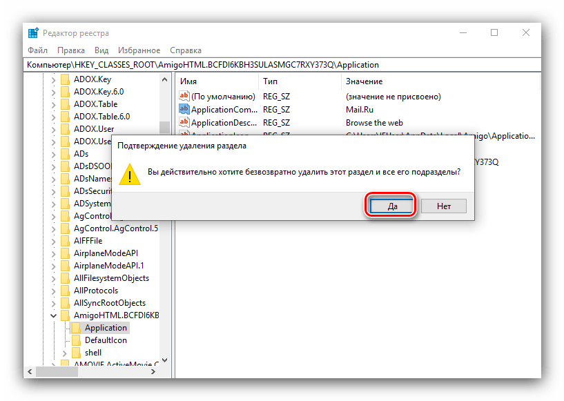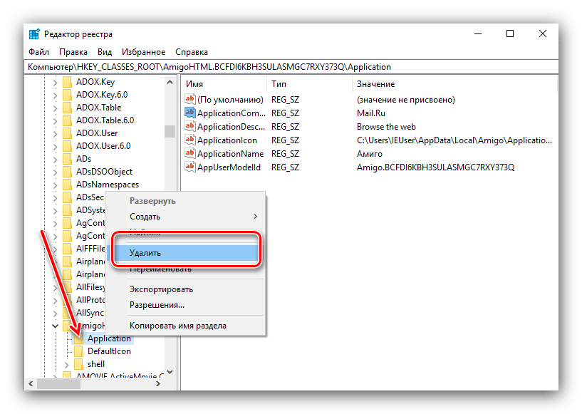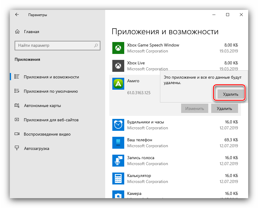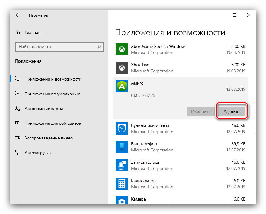 Удаление Амиго посредством встроенных в ОС инструментов состоит из нескольких этапов: деинсталляции основного приложения с помощью «Программ и компонентов» либо «Параметров» Windows 10, удаления остаточных файлов и правки реестра.