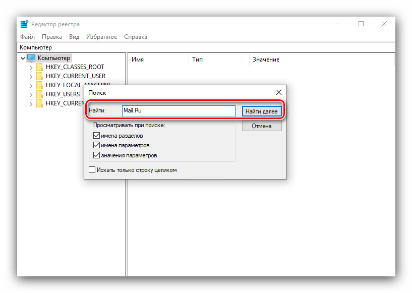В диалоговом окне поиска впишите Mail.Ru и нажимайте «Найти далее».