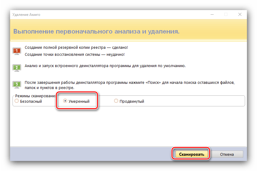 - Дождитесь, пока деинсталлятор сделает свою работу, затем возвращайтесь к окну Рево. Следующим шагом будет очистка реестра и остаточных файлов. Программа позволяет выбрать тип глубины сканирования, варианта «Умеренный» будет достаточно. Для начала процедуры нажимайте «Сканировать».