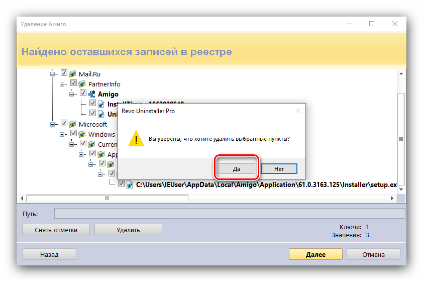 Ставим галочку и нажимаем «Удалить». Далее, нажимаем на «Поиск». Программа начинает искать все следы Amigo. Мы видим результат деинсталляции. Ставим галочки над всеми пунктами, выделенными жирным (программа нашла разделы в реестре, оставленные браузером). Жмём Удалить.