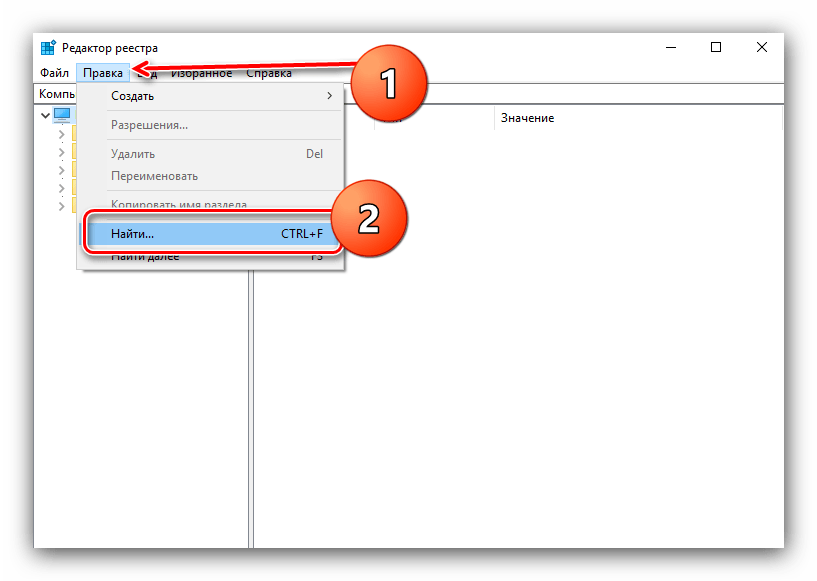 После запуска «Редактора реестра» воспользуйтесь меню «Правка», в котором выберите пункт «Найти».