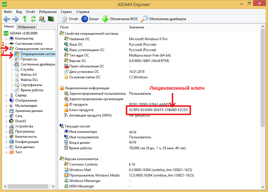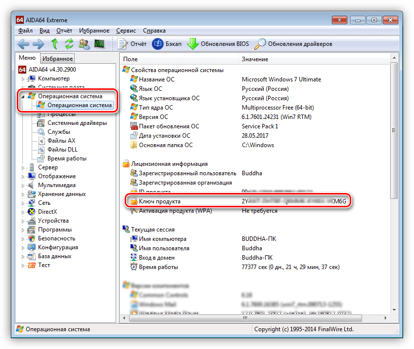 Если у Вас уже установлена AIDA (платная или пробная версия), то отобразить ключ на текущем компьютере можно на вкладке «Операционная система» > «Операционная система» в разделе «Лицензионная информация» в пункте «Ключ продукта».