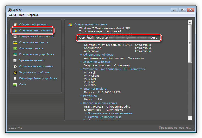 Для примера возьмем программу Speccy. В главном экране нажмите на кнопку Operating System (1). В правой части программы вы увидите Serial Number (2). Подобным способом можно найти серийный номер через другие вышеперечисленные программы.